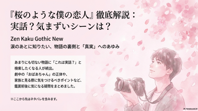 Netflixで話題の桜のような僕の恋人の実話に関する真相を徹底調査。本作はフィクションですが、著者の入院経験や実在する難病がモデルとなっています。記事では桜のような僕の恋人は実話なのかという疑問への回答に加え、老婆の正体や気まずいシーンも解説。物語の裏側を知り、感動を深めたい方は必見です。